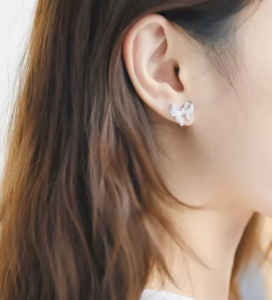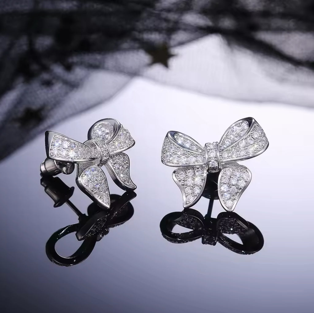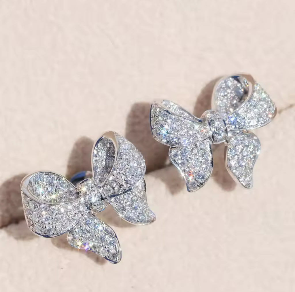 A pair of luxurious earrings designed in the shape of delicate bows, each encrusted with numerous sparkling cubic zirconia diamonds. The earrings are set in a shiny metallic base, stainless steel which enhances the brilliance of the diamonds.