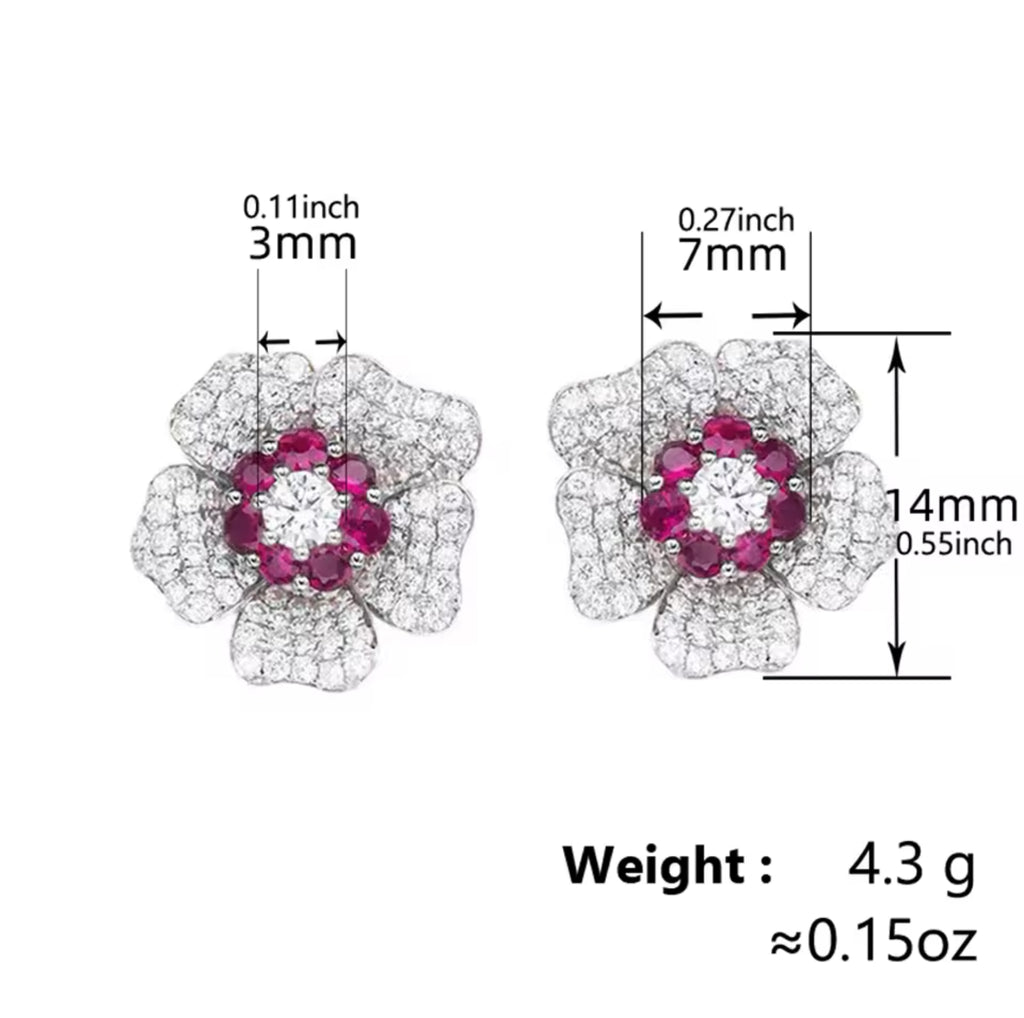 A pair of intricately designed flower-shaped earrings, featuring a central arrangement of sparkling white diamonds surrounded by a circle of vivid red rubies, creating a striking contrast. Each petal of the flower is encrusted with smaller diamonds, enhancing the overall luxurious appearance. Detailed measurements indicate the size of various elements: the entire earring has a width of 14mm or 0.55 inches, while individual rubies measure 3mm or 0.11 inches, and the petals are 7mm or 0.27 inches wide. The total weight is specified as 4.3 grams, equivalent to approximately 0.15 ounces, suggesting a delicate and lightweight design.