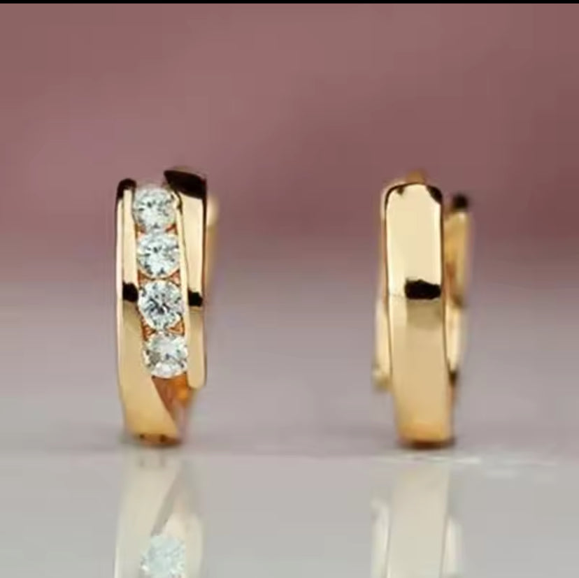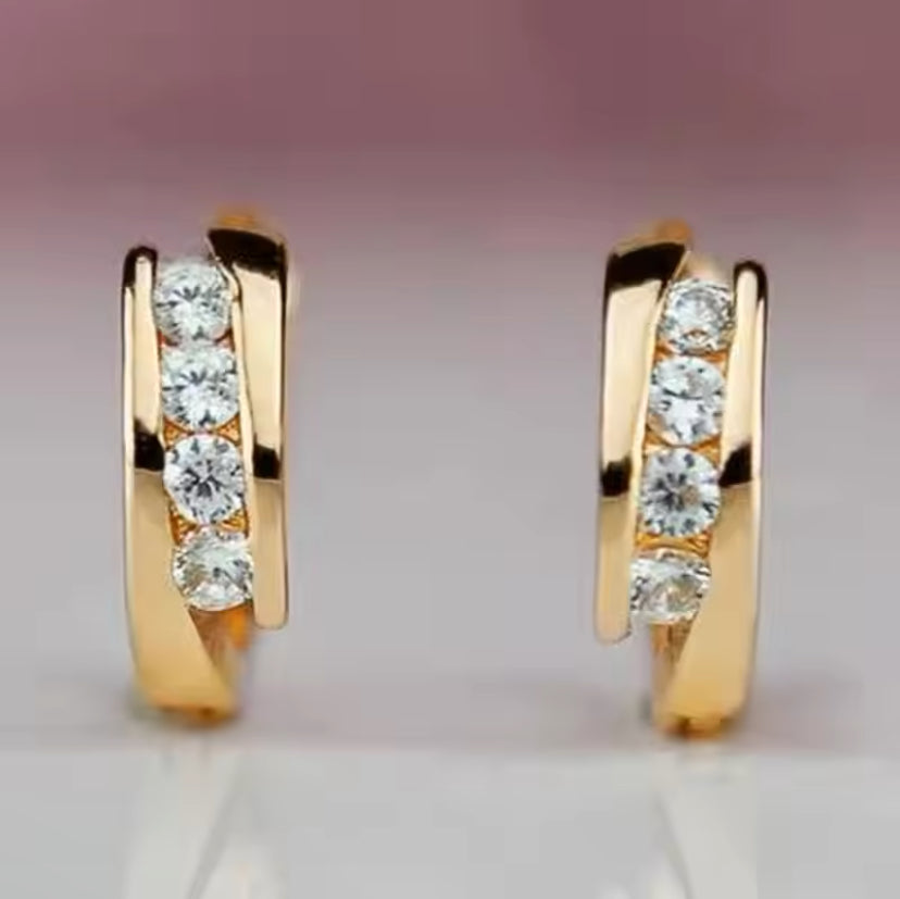A pair of exquisite gold earrings features a sleek, curved design. Each earring is adorned with a row of four sparkling white diamonds set vertically along the front. The diamonds are round-cut, enhancing their brilliance and providing a luxurious contrast against the warm golden hue of the metal. The earrings have a polished finish, adding to their sophisticated and elegant appearance.