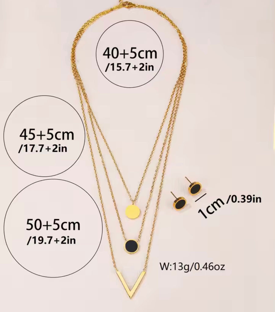 A stainless steel multilayered gold necklace combined with black studs creates soft and luminous contrast. The necklace typically features several layers of delicate gold chains, creating a rich, textured appearance that adds depth and sophistication to the design. The stainless steel construction ensures durability and resistance to tarnishing, while the gold plating provides a luxurious finish.