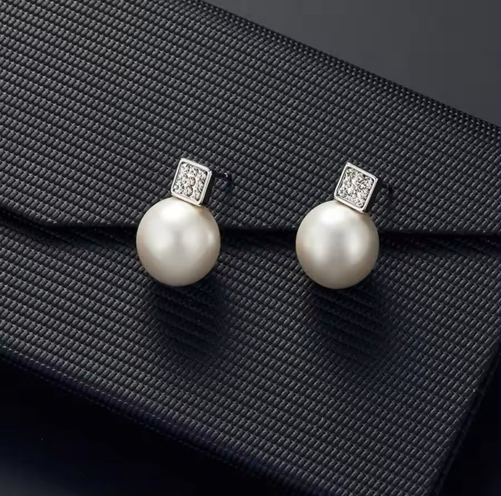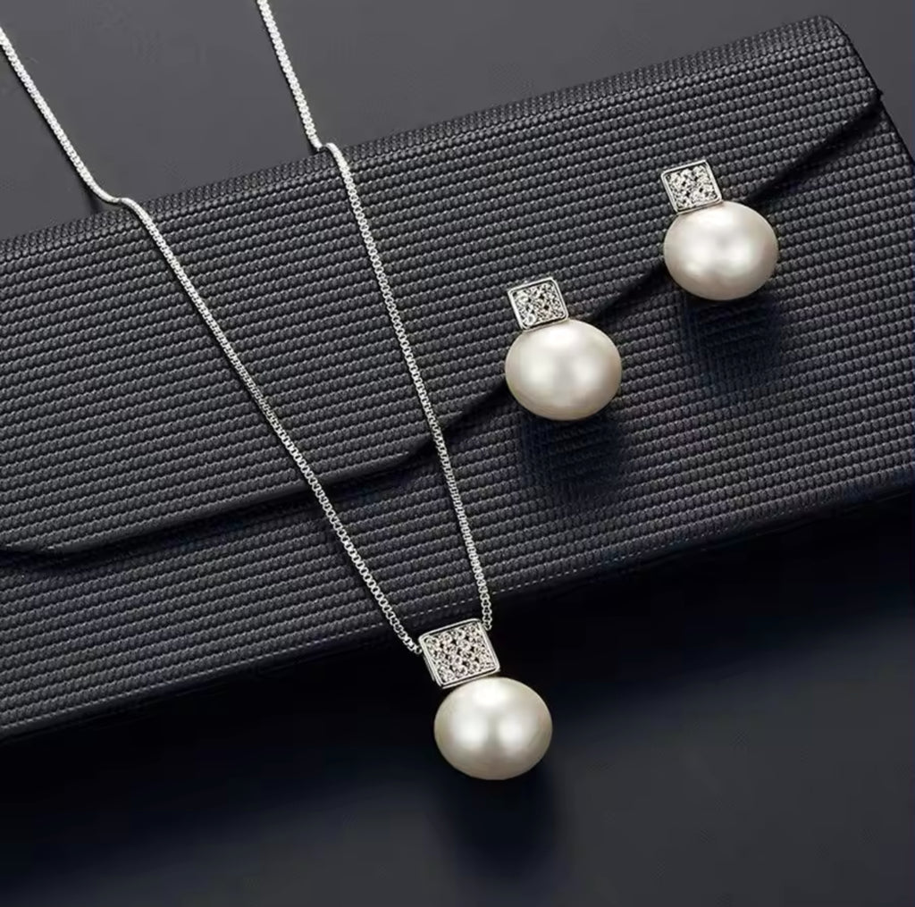 This elegant set includes a necklace and matching earrings, both featuring large, luminous white pearls as the centerpiece. The pearls are attached to a silver square-shaped setting adorned with small sparkling diamonds. The simplicity of the design, coupled with the sophistication of pearls and the shine of diamonds, makes this set perfect for formal occasions or when you want a touch of class. The stainless steel structure ensures durability while maintaining a luxurious appearance.