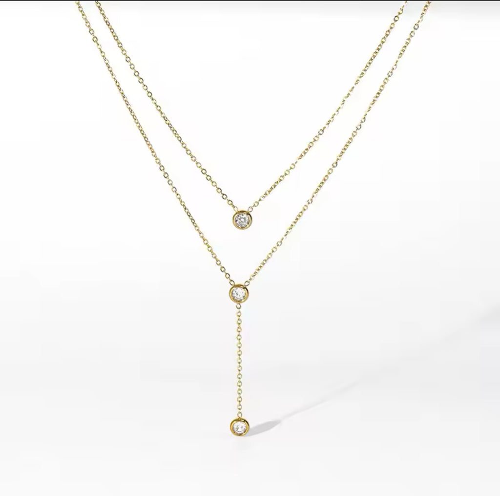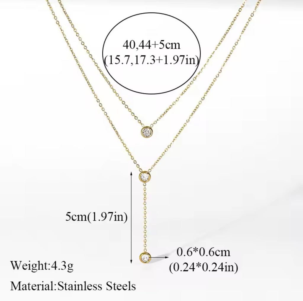 This stylish double-layer necklace for women is crafted from high-quality stainless steel, ensuring durability and a sleek, polished look. The design features two delicate chains of varying lengths, creating a beautiful layered effect. Each layer is adorned with a sparkling crystal pendant that adds a touch of elegance and shine to the piece. Perfect for both casual and formal occasions, this dainty necklace effortlessly enhances any outfit with its modern and versatile style. Lightweight and comfortable for all-day wear, it features a secure clasp for easy fastening and adjustable length to fit any neckline. This necklace is ideal for anyone looking to add a subtle yet sophisticated touch to their jewelry collection.