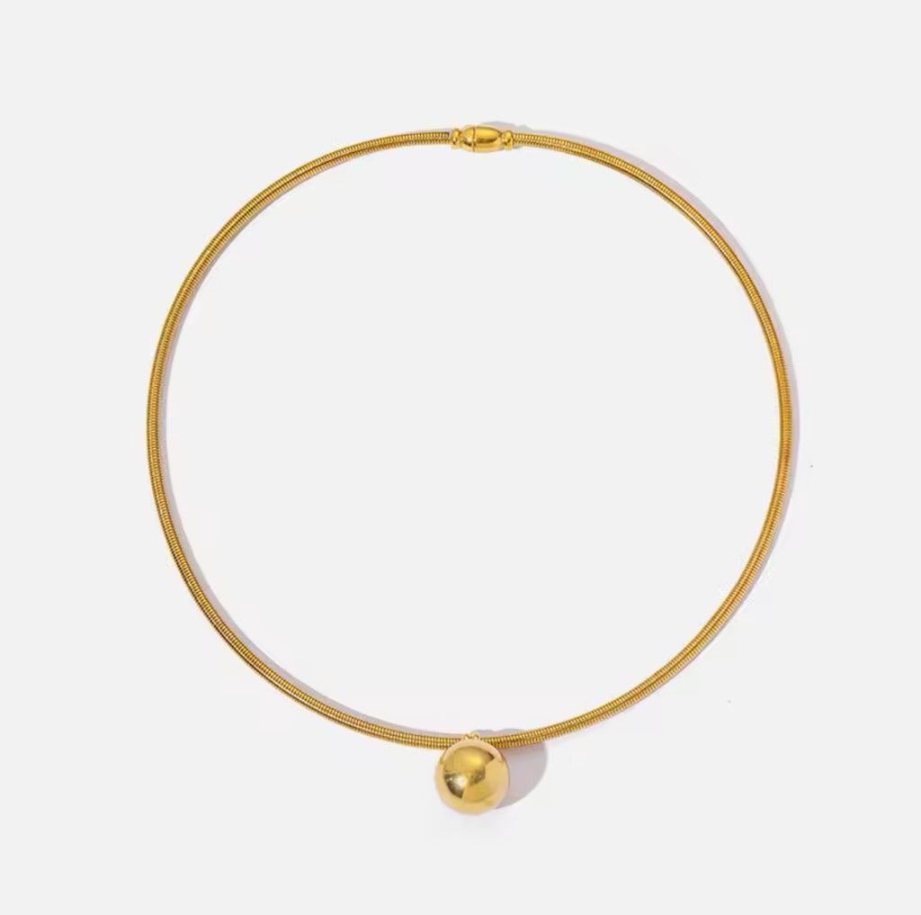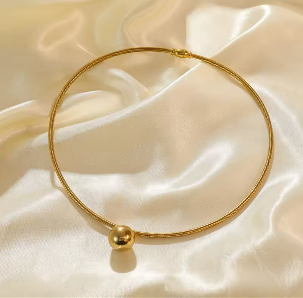 A delicate stainless steel gold choker necklace featuring a sleek, minimalist design. The necklace measures 42 centimeters in length and weighs 15 grams. It is comprised of a smooth, gold-colored band that forms a circular loop, with a small, polished spherical charm positioned near the bottom. The sphere measures 1.8 by 1.8 centimeters, adding a subtle but sophisticated focal point to the piece. The overall design is simple yet stylish, perfect for a variety of occasions.