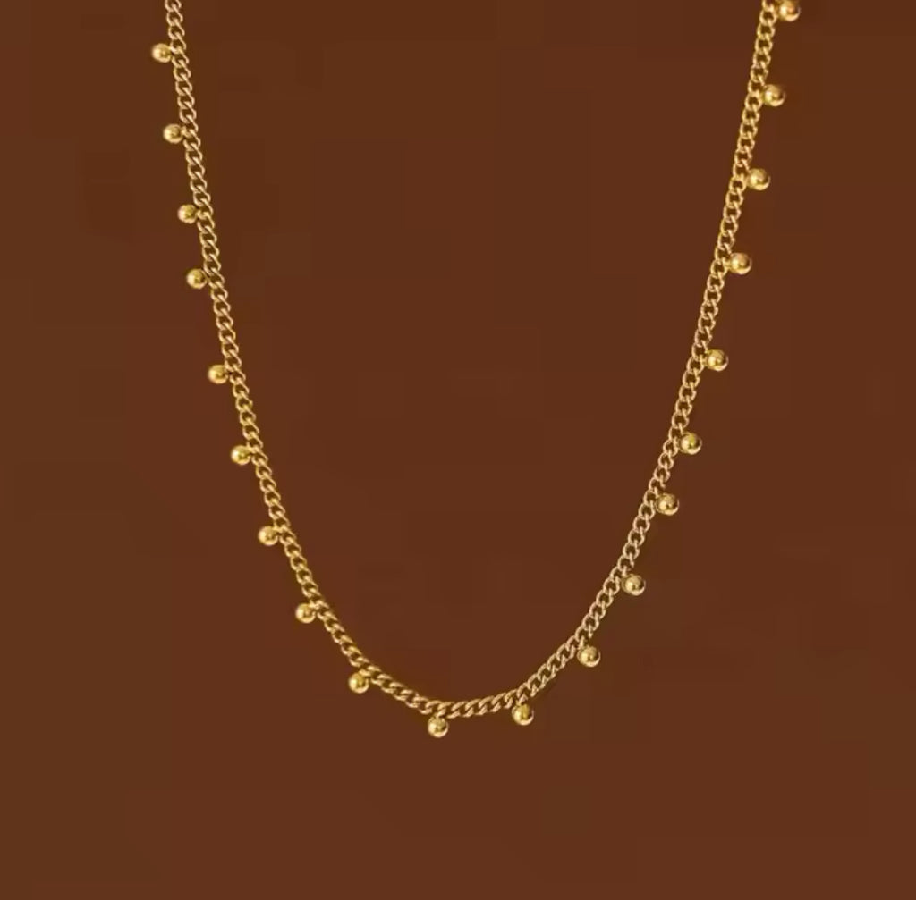 A delicate stainless steel gold necklace crafted with a fine chain, adorned with small, evenly spaced gold beads. The necklace forms a graceful curve, emphasizing its elegant simplicity. The gold beads catch the light, adding a subtle shine, This jewelry piece exudes elegance and sophistication.