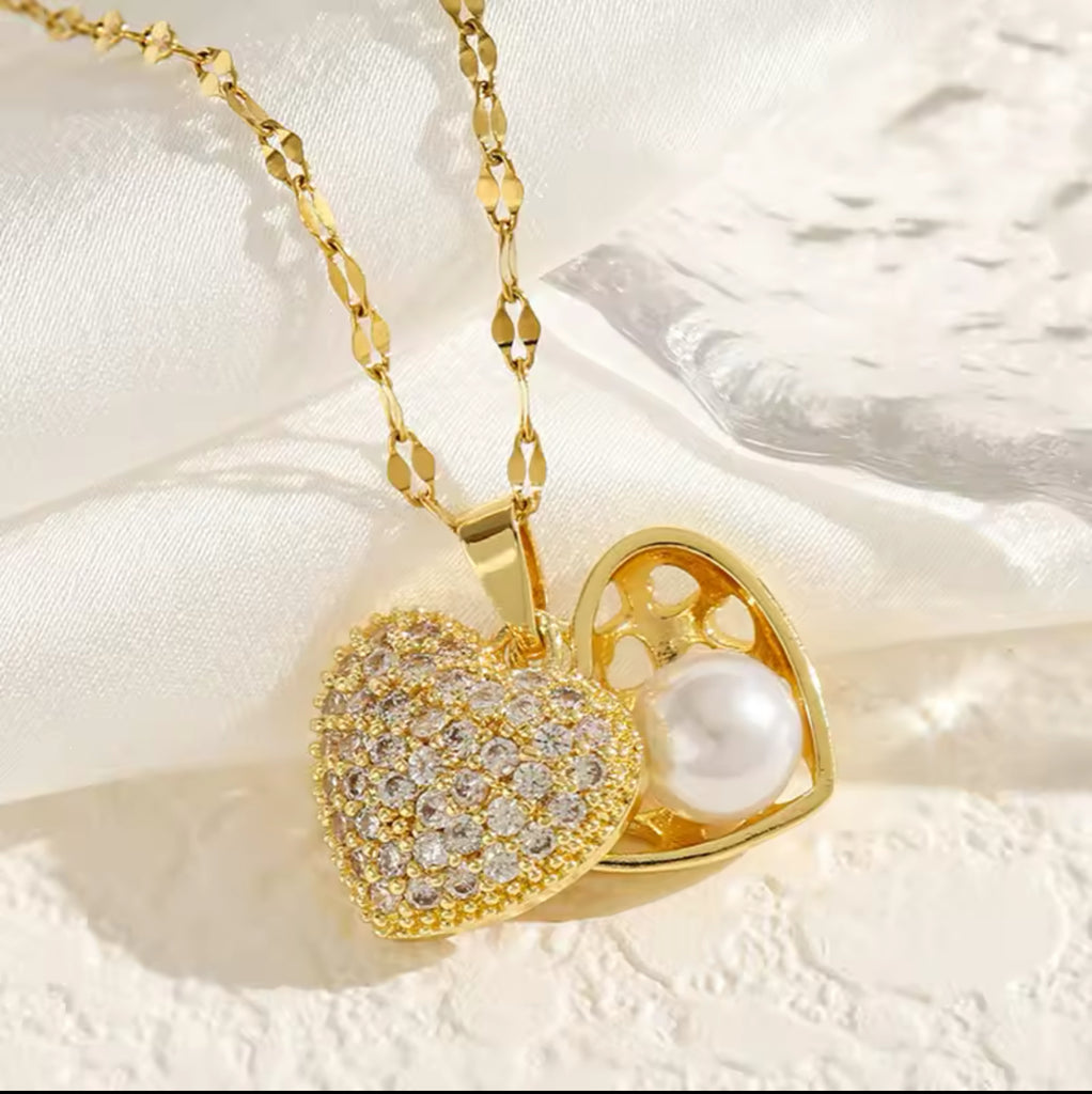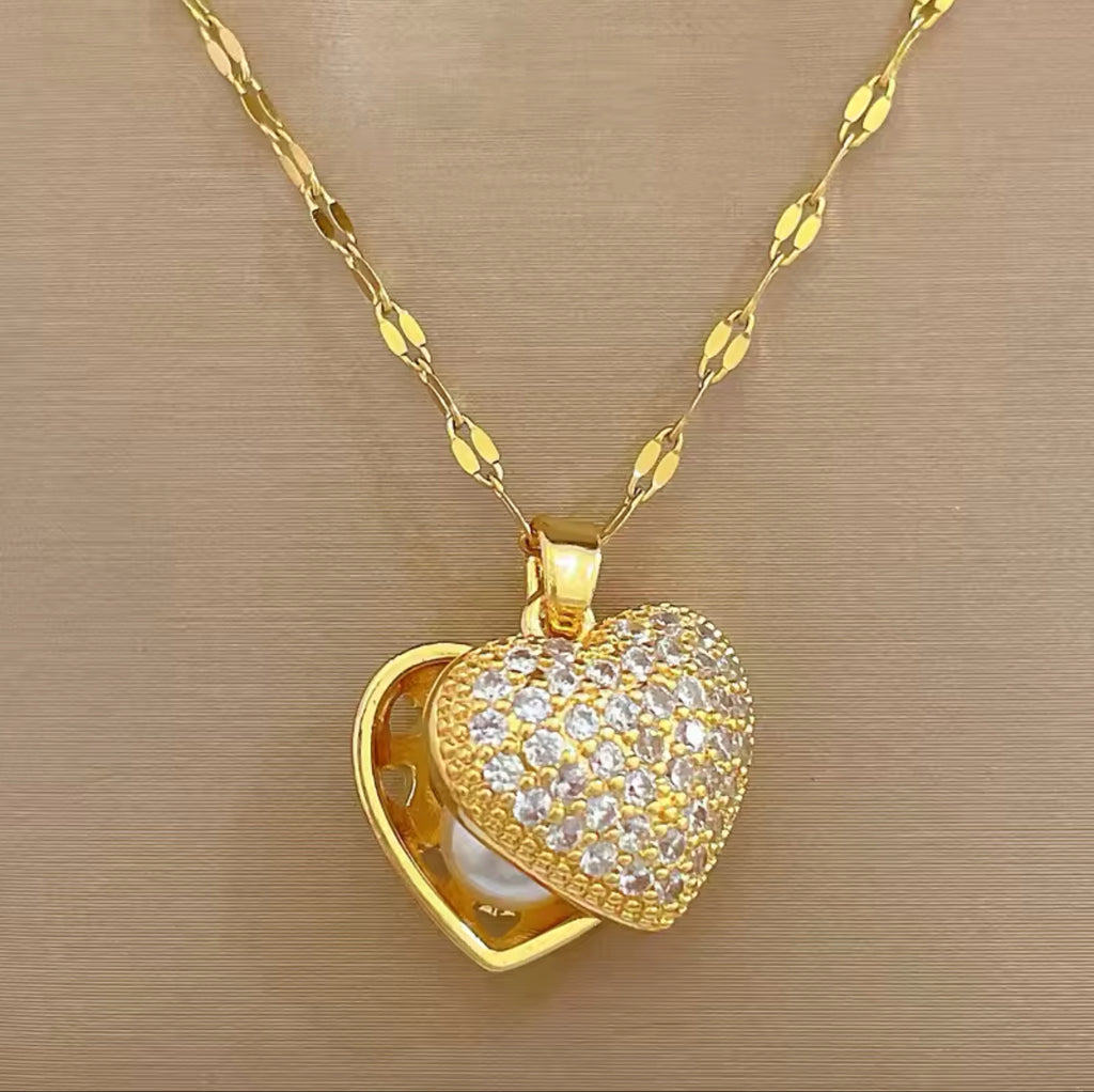 This luxurious stainless steel gold necklace features a stunning heart-shaped locket, elegantly adorned with sparkling cubic zirconia diamonds. The locket opens to reveal a lustrous pearl inside, symbolizing timeless elegance and charm. The delicate gold chain, with its intricately linked design, beautifully complements the heart pendant, creating a sophisticated and enchanting accessory.