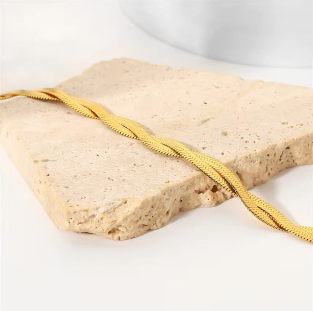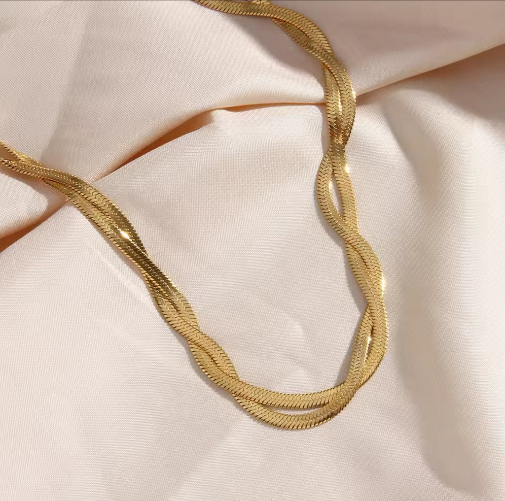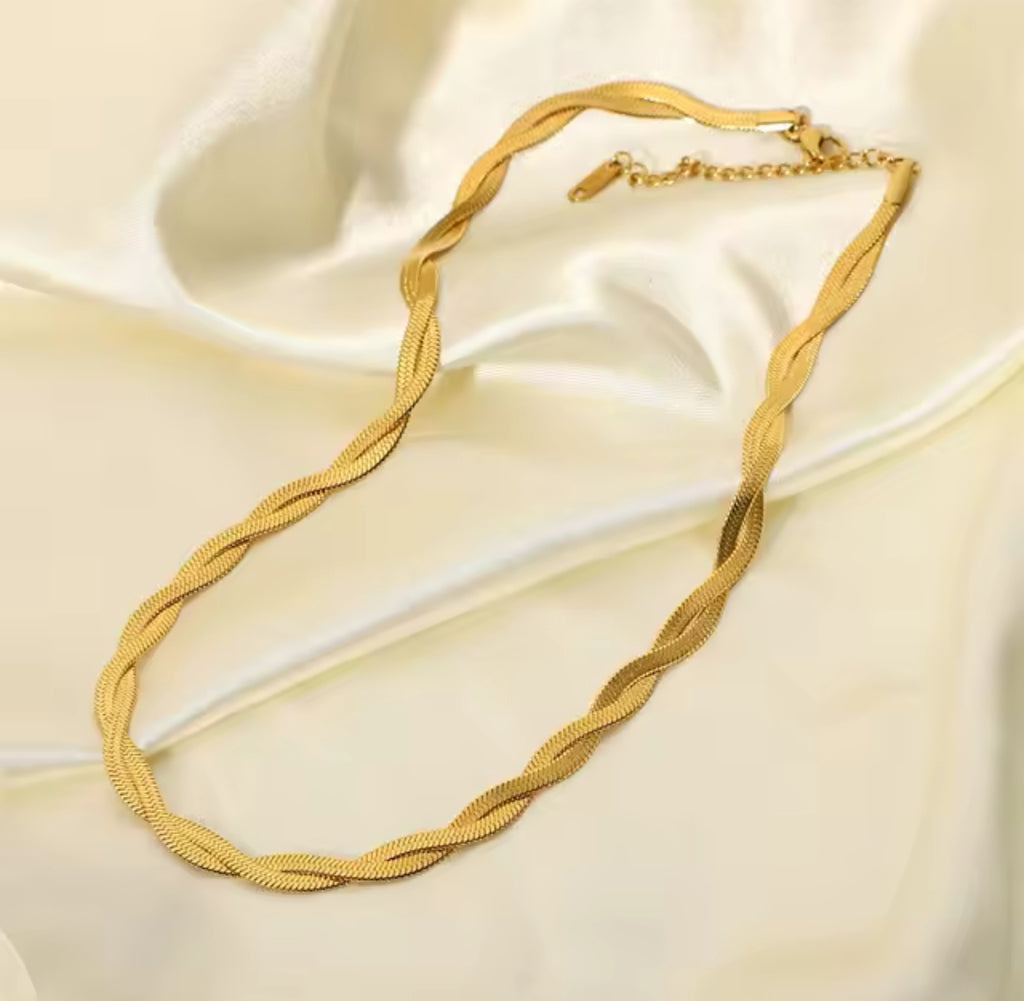 This exquisite twisted gold necklace showcases a stunning, intricate design that beautifully captures light from every angle. The twisted pattern creates a sense of movement and adds depth, giving the piece a sophisticated allure. Crafted from high-quality stainless steel it has a rich, warm hue that complements any skin tone and enhances both casual and formal outfits.