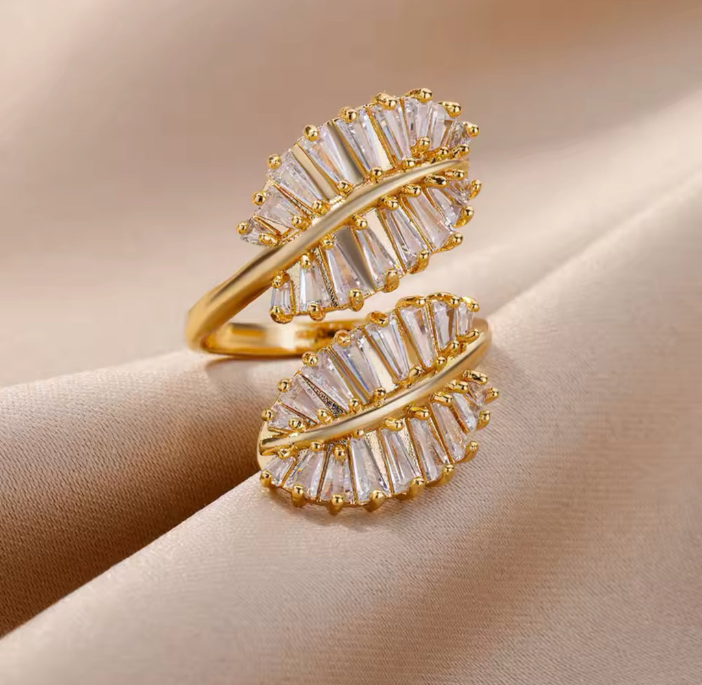 This elegant stainless steel gold  adjustable ring features a stunning design with a luxurious finish. At its center, a leaf design is studded with lustrous sparkling  zirconia stones, adding a touch of sophistication and brilliance. The high-quality stainless steel construction ensures durability and a sleek appearance, while the gold finish provides a rich, timeless appeal. Perfect for both everyday wear and special occasions, this ring combines classic charm with modern elegance.