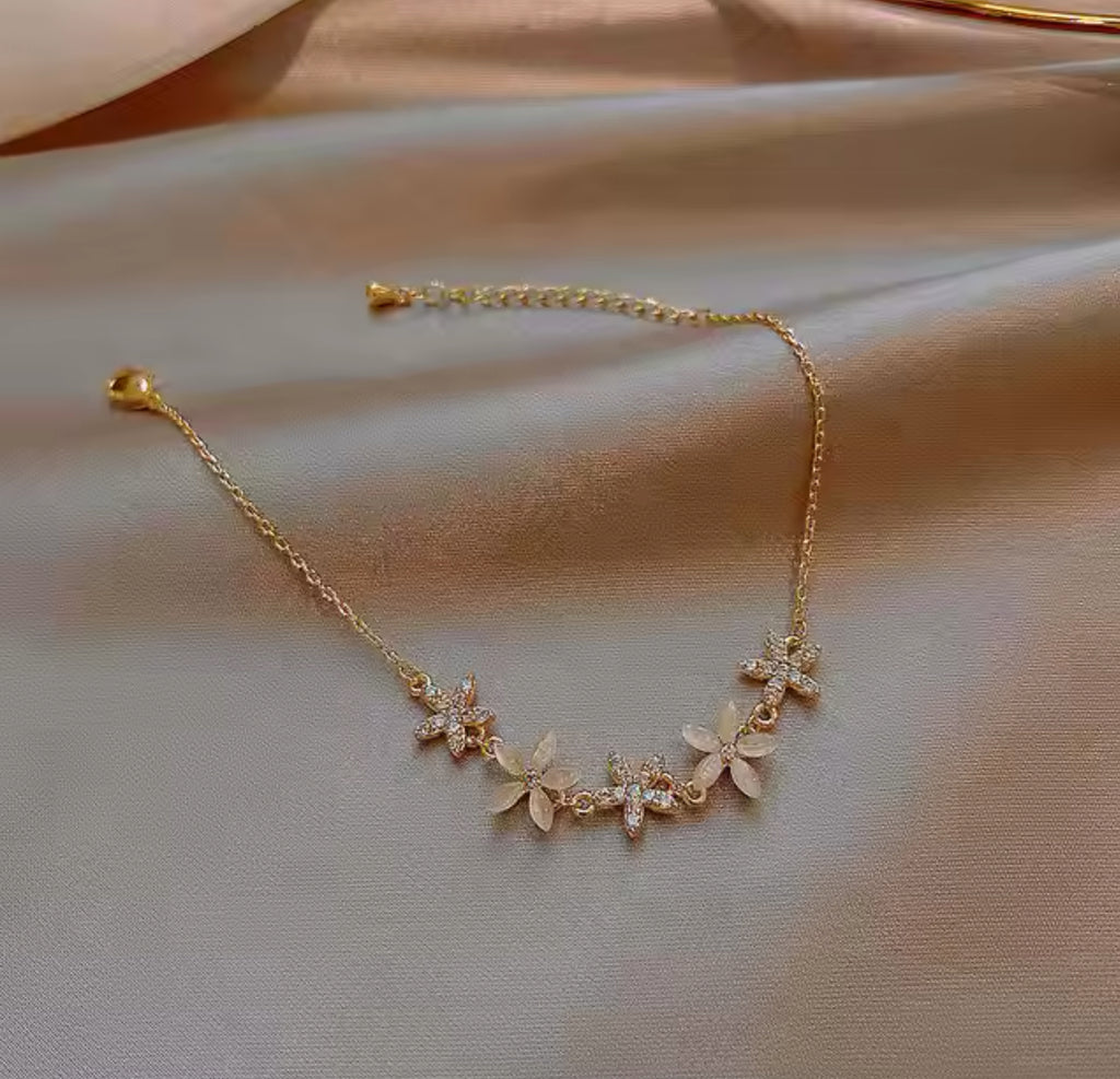 This delicate stainless steel gold bracelet is a beautiful blend of charm and elegance. Adorned with a series of intricately designed small flowers, each flower showcases detailed petals and a sparkling stone at its center, adding a touch of brilliance. The thin golden chain enhances the bracelet’s subtlety, making it a perfect accessory for layering or wearing solo. Its refined design makes it suitable for both casual and formal occasions, embodying a timeless elegance.