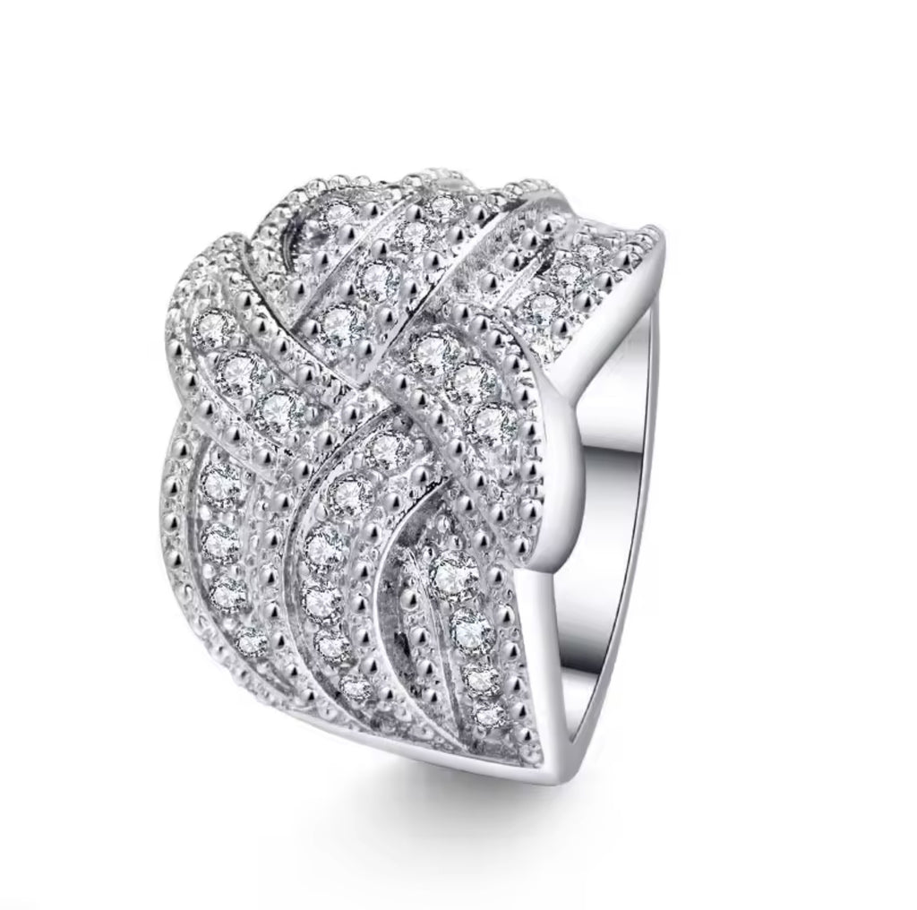 A luxurious, wide-band ring featuring an intricate design of interwoven rows fully encrusted with sparkling diamonds. The ring showcases a sophisticated lattice pattern with diamonds carefully set into each row, creating a dazzling effect with its reflective surfaces. Crafted in a bright, polished metal, likely white gold or platinum, the ring exudes elegance and opulence, making it a stunning statement piece