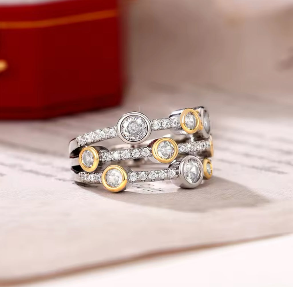A luxurious ring featuring an intricate design with multiple bands intertwined. The bands are adorned with various sizes of brilliant round-cut diamonds set in both silver and gold settings, creating a stunning visual contrast. Smaller diamonds accentuate the bands, adding extra sparkle and elegance. The combination of the metals and the clustered diamond arrangement gives the ring a modern yet timeless appearance, perfect for special occasions. Made of stainless steel and cubic zirconia.