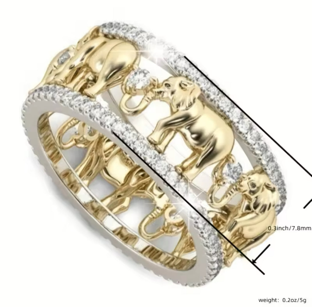 This exquisite stainless steel gold ring showcases a beautifully detailed procession of elephants encircling the band. Each elephant is meticulously crafted, with raised trunks and legs that highlight their intricate features. The ring is elegantly bordered by two rows of sparkling cubic zirconia diamonds, enhancing its luxurious appeal. Measuring 0.3 inches (7.8 mm) in width and weighing 0.2 ounces (5 grams), it strikes a perfect balance between opulence and everyday wearability.