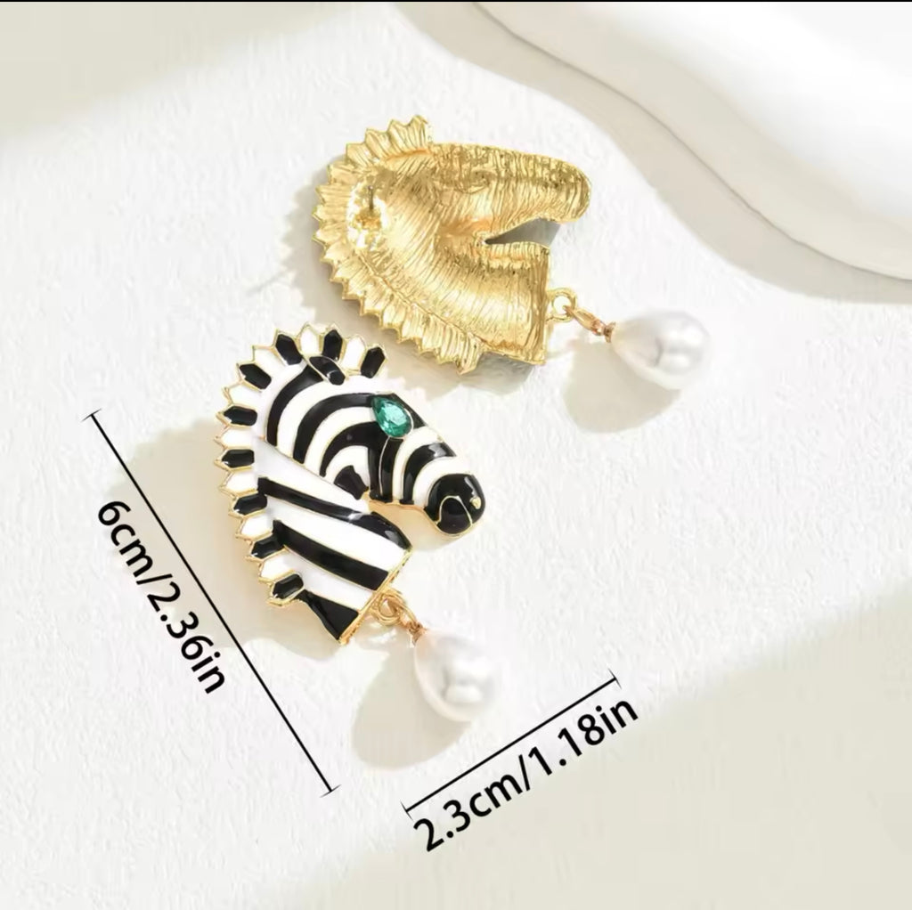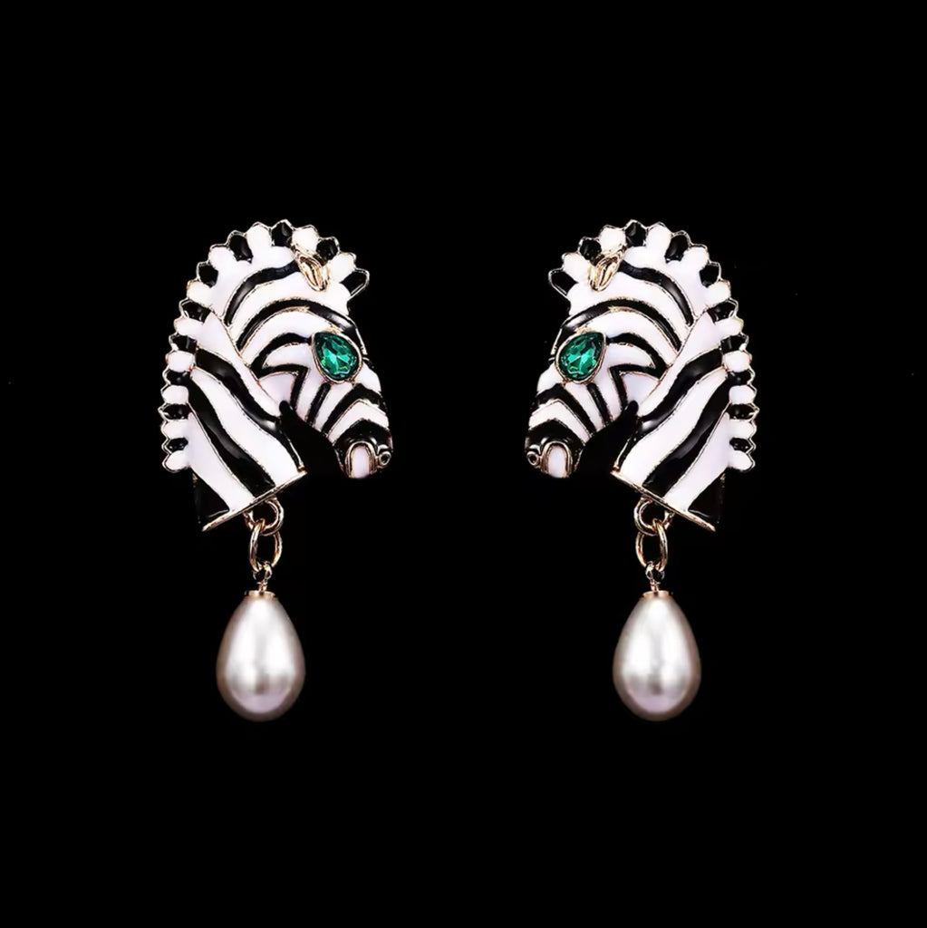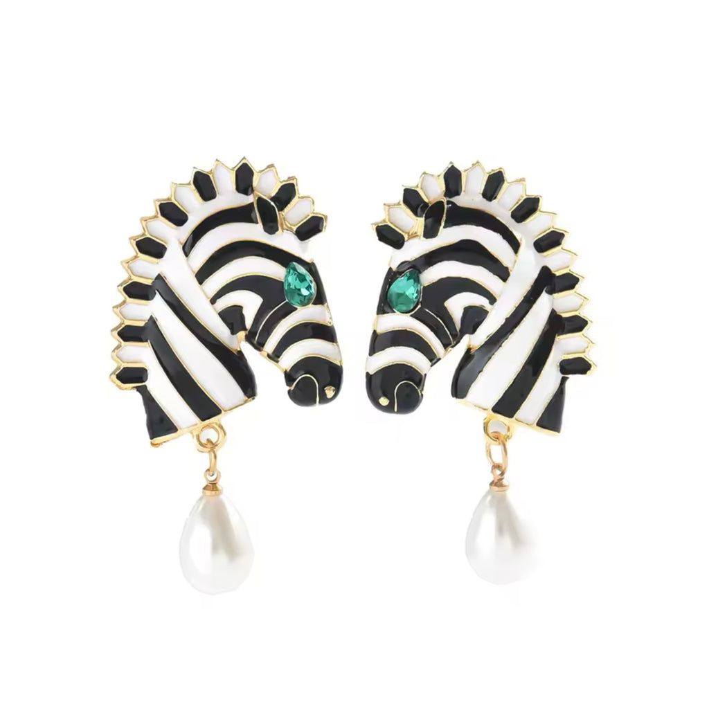 These stainless steel earrings feature a playful and creative design, with each earring shaped like a zebra's head. The zebra pattern, highlighted by bold black and white enamel stripes, adds a chic and stylish touch. The emerald-colored eyes give a pop of vibrant color and sophistication, contrasting beautifully with the monochrome body of the zebra. Dangling from each earring is a delicate, lustrous pearl drop, which enhances the overall elegance and adds a hint of timeless charm.